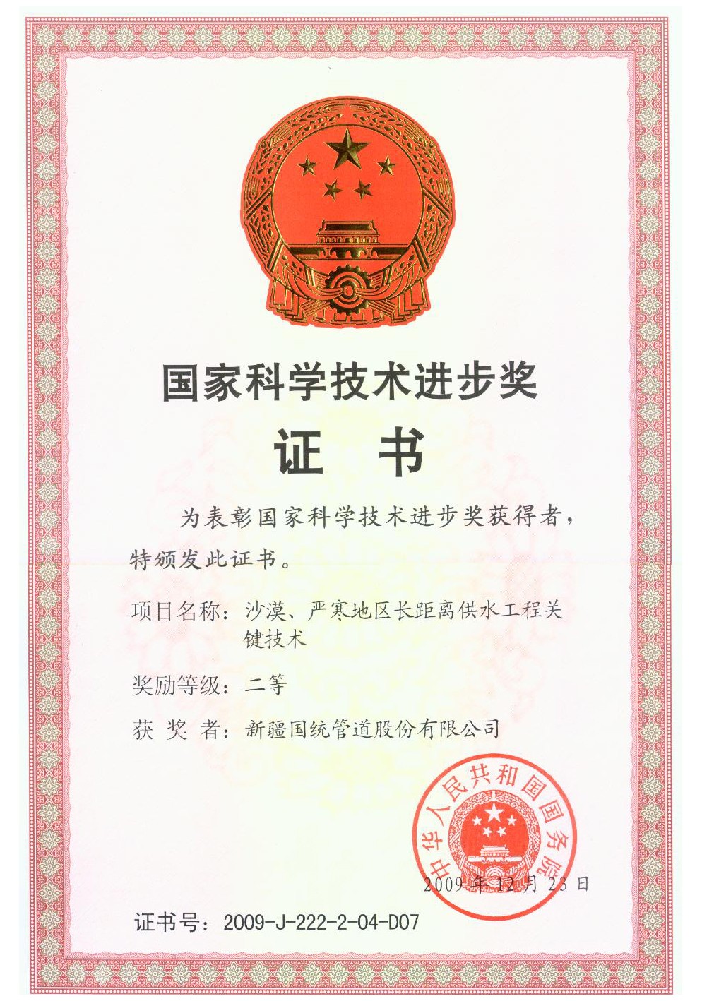 • 國家科學技術進步獎證書